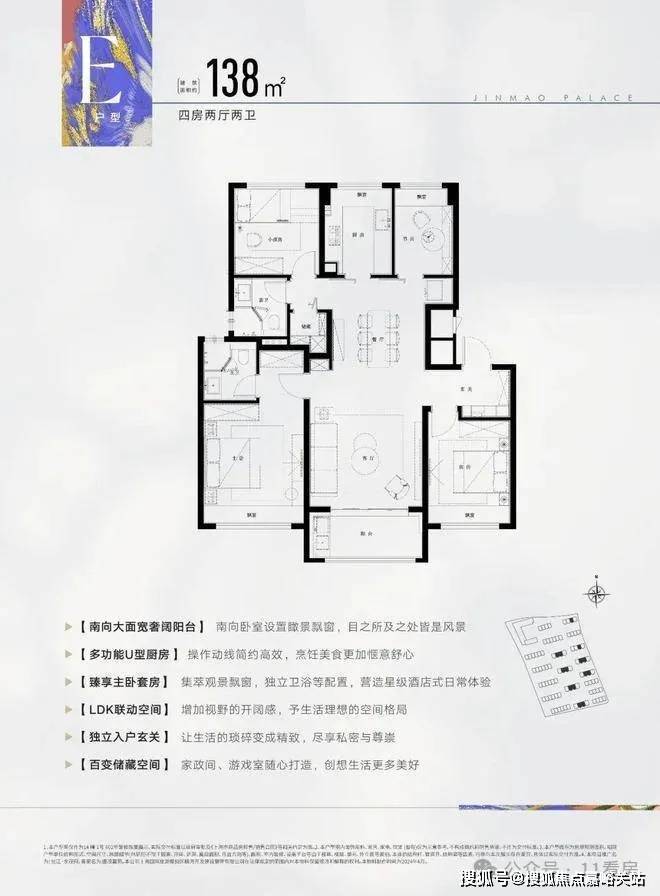 建筑面积约138㎡4房2厅2卫,做到了 3开间朝南+主卧套房设计+南卧带飘窗+卫生间干湿分离,空间更加阔绰!