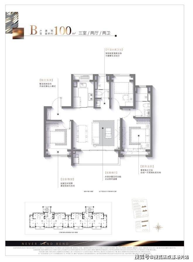 而建面约100㎡的三房两厅两卫户型,可以说是约96㎡3房的升级版,空间更加延展,整体横厅面宽约5.2米(轴中距),形成更大的南向采光面,且搭配南向观景阳台,直接做到了3.5面宽朝南,这在同类产品中是比较少见的。