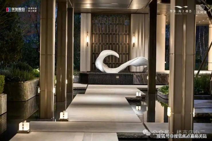 进入华发海上都荟社区,首先映入眼帘的是约24.8米高的尊奢门庭,入口雕塑造型取自卡地亚的经典产品Trinity,营造出高贵典雅的归家仪式感。