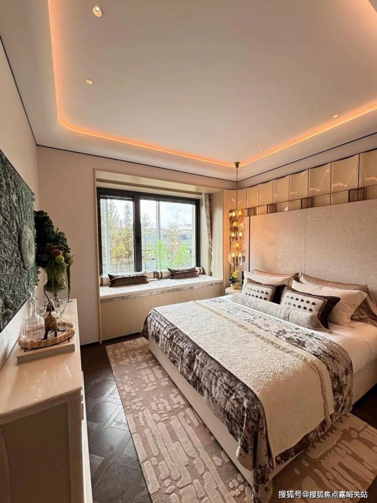 这可能是我见过 弧形元素 最多的样板间,吊顶、客厅墙面及卧室背景墙均采用大量曲面处理,涵盖木饰面与奢石等多种材质弧形工艺,即便工序复杂且成本高昂,但绿城仍坚持落实,只为业主更高级的使用体验