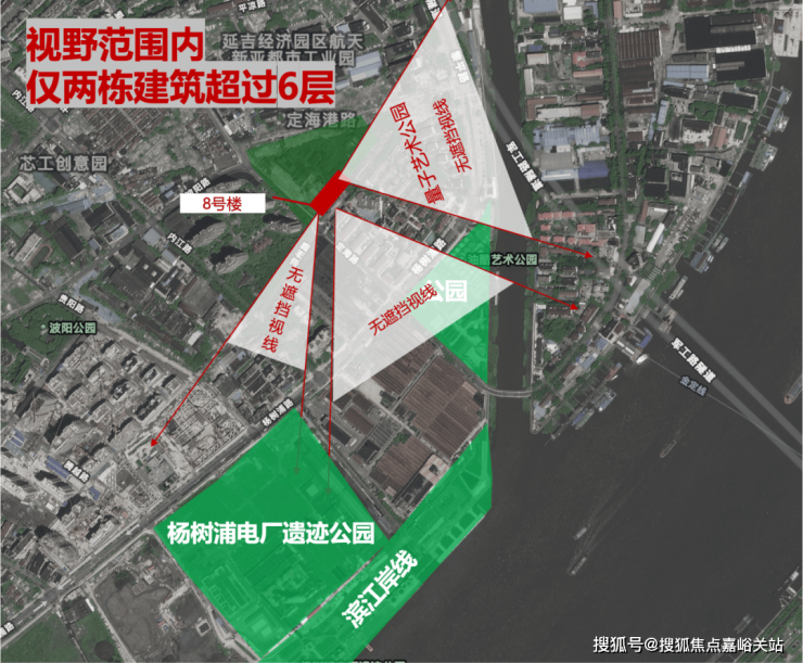 保利誉滨江踞于杨浦滨江亲江位置,距黄浦江岸仅约500米(数据来源于百度地图直线测距)。 而8号楼,更位于整个社区的南侧,靠近黄浦江,南侧无高层楼栋,整体视野非常开阔,从复兴岛到黄浦江视野,几乎无遮挡。