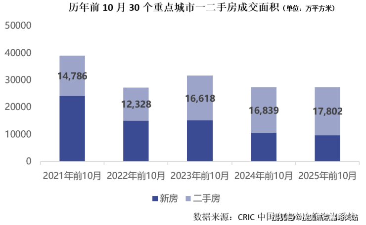 从一二手房累计成交面积来看,今年前10月30个重点城市一二手房成交总面积为27443万平方米,与2024年同期持平。