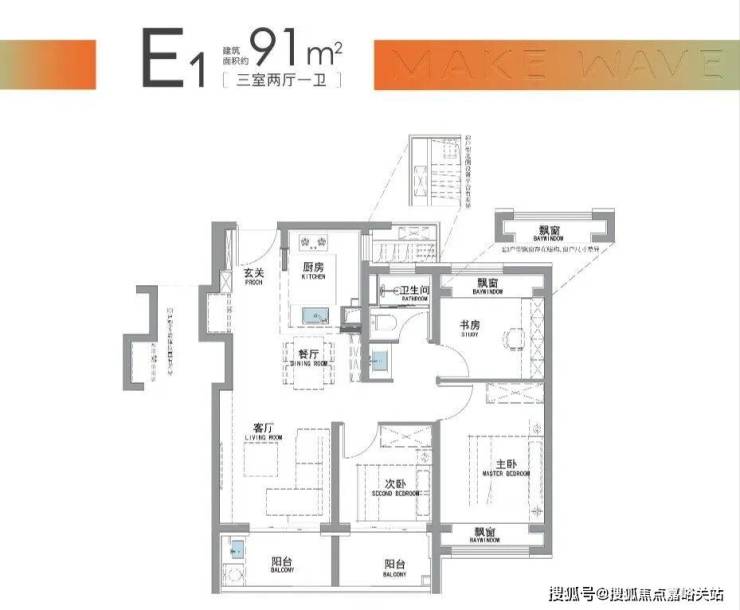 而招商·时代潮派|东屿此次建面约91㎡户型,就做出来了比市面百平户型更好的的 “南向双阳台+南北双飘窗” 设计。