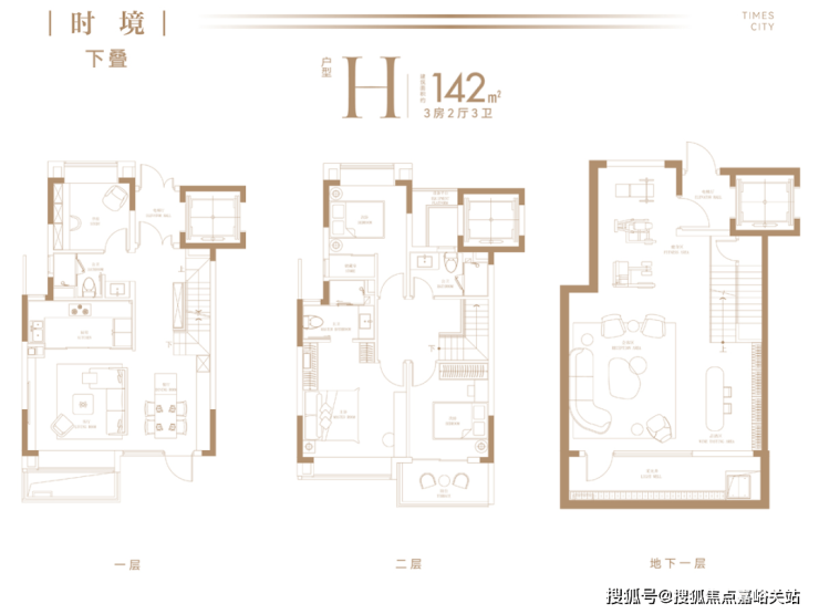 以建面约142㎡下叠为例,地上两层、地下一层阔绰空间,动静科学布局,全面考量三代同堂与二胎家庭的居住空间需求,以人性化质感空间演绎舒奢生活。