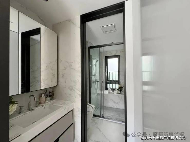 双卫配置,其中一个做了干湿分离,科勒台盆+双智能马桶,除雾镜柜均内置了牙刷消毒器、预留吹风机插座。主卫镜柜还有美妆冰箱,收纳空间相当充足。