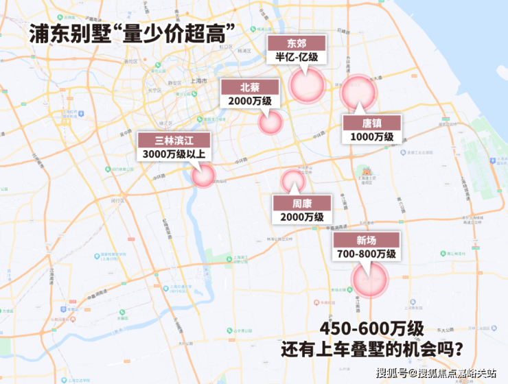 我标注了近两年浦东有别墅供应的区域,外环内基本2000万起步,唐镇1000万级,甚至你买到新场都要700-800万级。