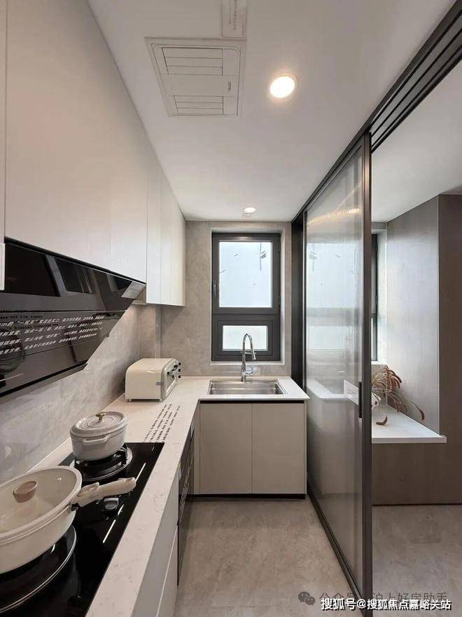 LDKB一体化设计。通过金属玻璃移门和岛台联动,达成餐厨一体,增加家庭成员互动。烟道外置以及S墙内嵌设计,优化空间布局,提升台面使用感和转角柜使用频率。