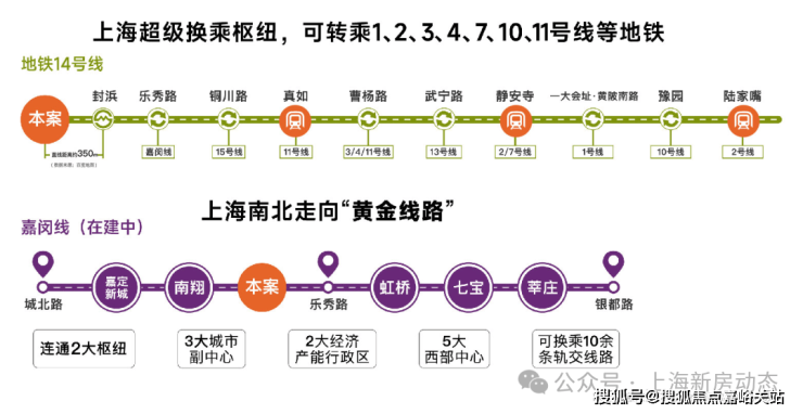 交通能级不断跃升:14号线和嘉闵线(在建中)双轨交汇,步行约200米14号线地铁口,14号线为高能级地铁线,5站普陀,30分钟直达静安,且始发有座,出行舒适;黄金走廊嘉闵线加速建设,约3站虹桥枢纽,未来可速达七宝、徐家汇、莘庄等核心区域。项目周边开泰路即将建成,绿野谷二期路段、骏达路、童家桥路、昌瑞路、涟澜路已启动建设,预计2026年建成。