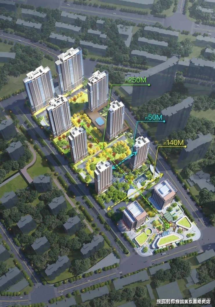 更关键的是主景观轴—— 纵向约250m、横向约140m,楼间距约50–57m,这在市区紧凑地块里极为少见。