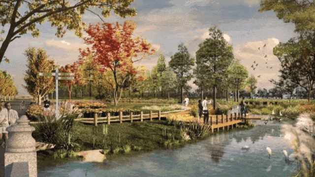这是一条贯穿整个新城的生态通道,全环区段长度约 45 公里、约100米宽,将因地制宜打造集跑步、慢步、骑行等功能于一体的慢行体系。
