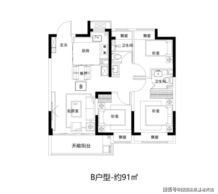 建面约91㎡3房2卫,三开间朝南,客餐厅连通大阳台, 四飘窗设计,好户型该有的素质它都有。