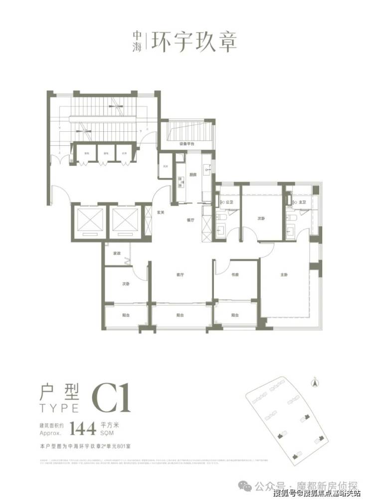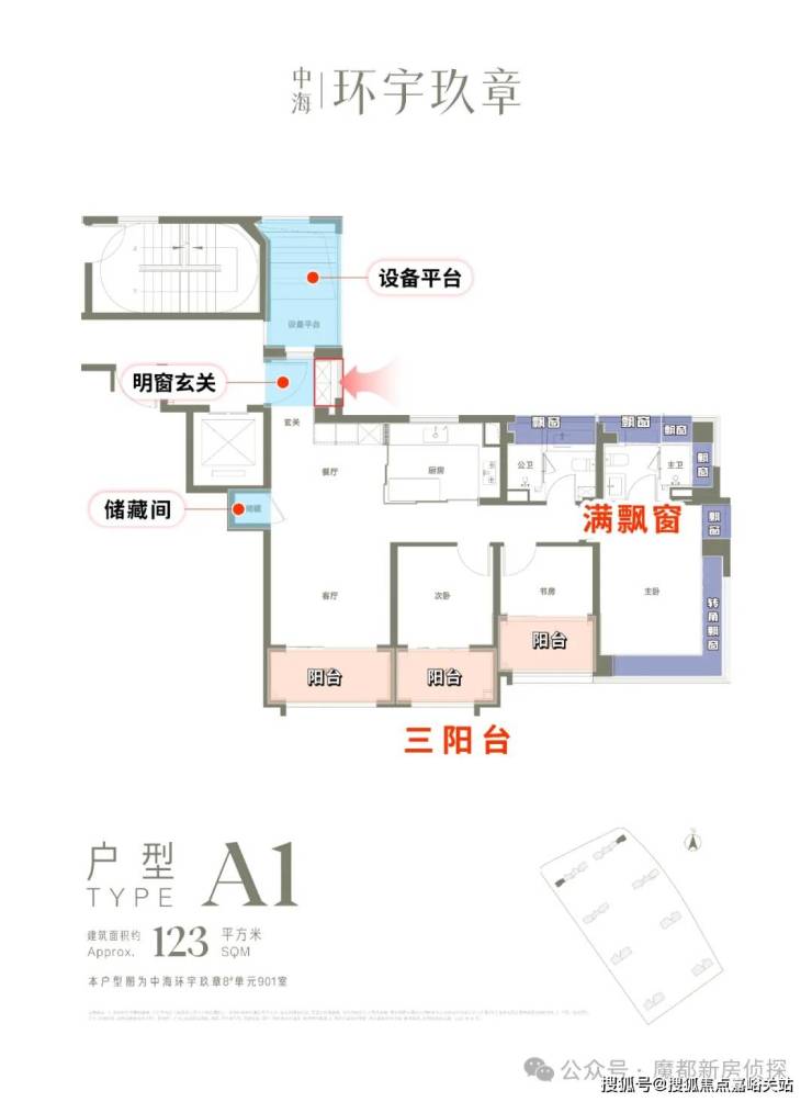 以建面约123㎡3房为例,区别市面上多数仅单或双阳台布局,该户型四面宽朝南+罕见的南向三阳台,实用性和采光度更强。