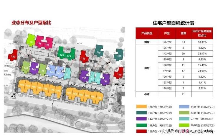 A地块的容积率最低,只有1.35,共有71套房源,由13套别墅和58套洋房组成,联排面积为196平,有独立的入户花园和地下附赠空间。洋房面积约97-198㎡。