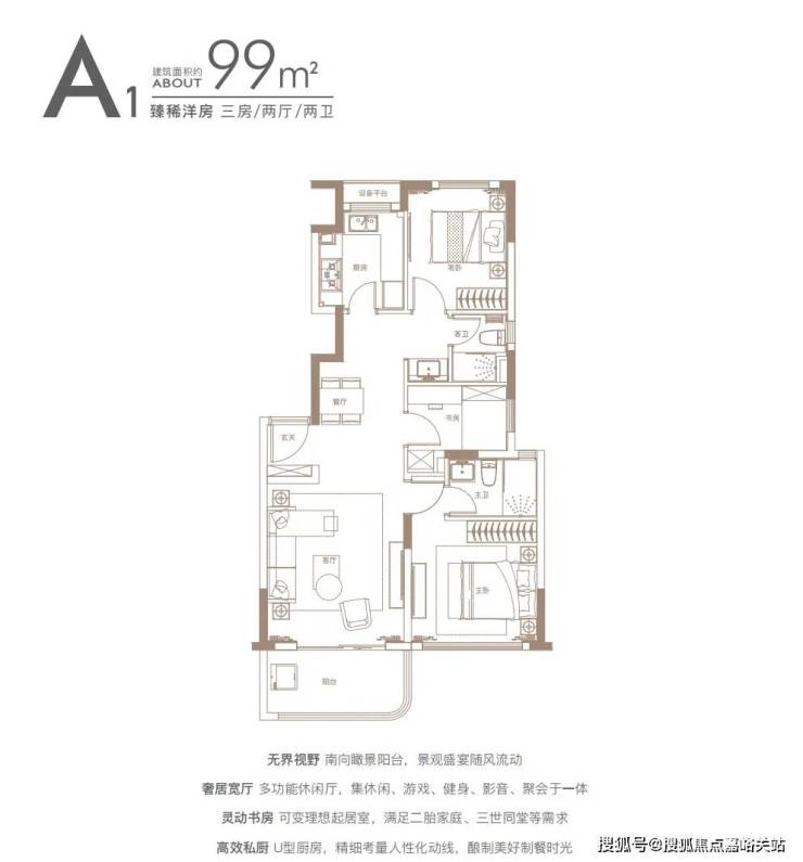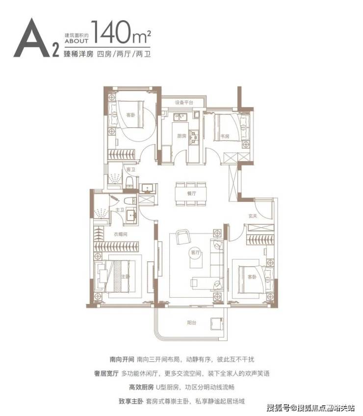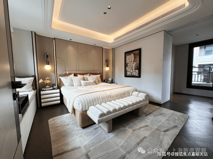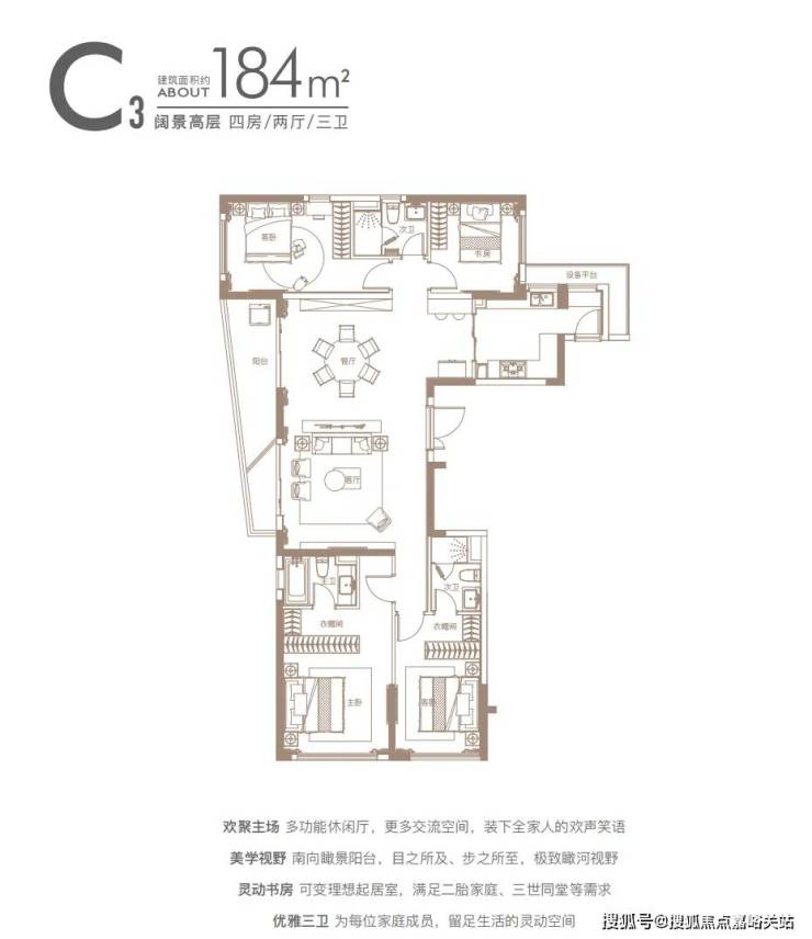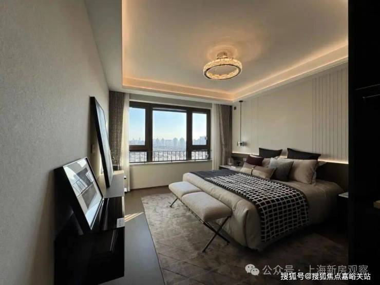 具体来看,主卧摘星露台,南北两侧配享约30㎡大面积使用空间,晨起可观朝霞,入夜可揽星河,将自然景致与日常生活无缝衔接;