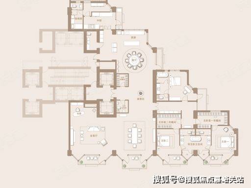 553㎡阔境大平层:五房三厅五卫格局,中西双厨设计,超大横厅可容纳家族聚会与商务社交,每间卧室均为套房,兼顾家庭成员私密与舒适。