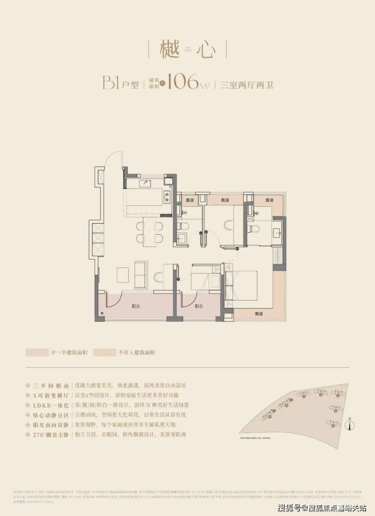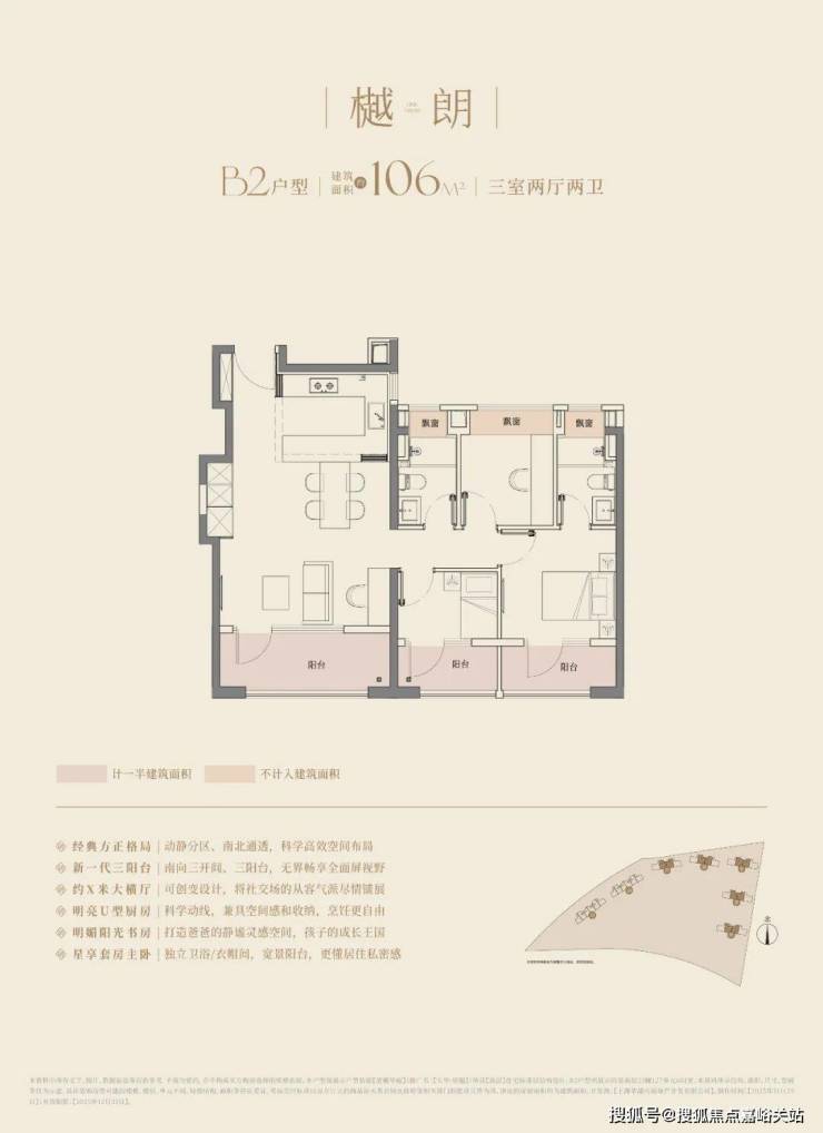 经典动静分离户型,预留分户“S”墙设计,三开间朝南+双阳台,阳台合仅计算一半建筑面积,主卧以及主卫附赠270°转角飘窗;