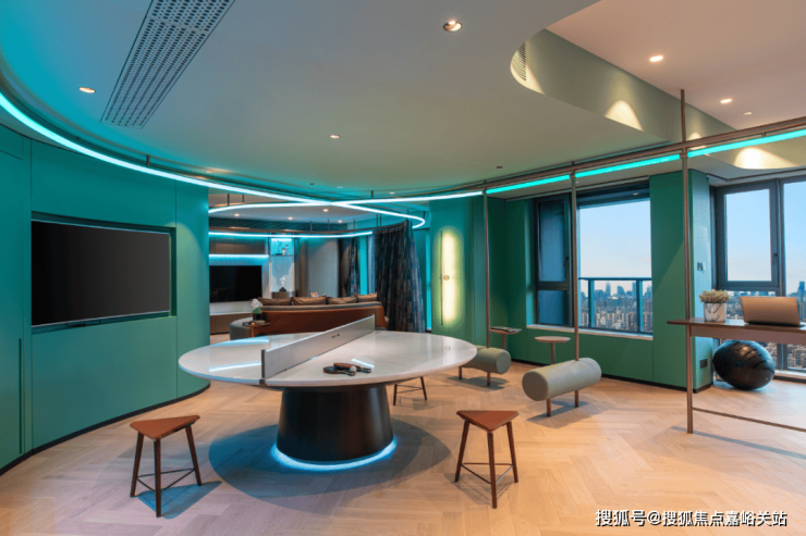 还有吧台、休闲洽谈区、共享会议和健身等功能区,是一个适合交友、会客、休憩、工作、读书、赏景的多功能空间.处处可见的时尚元素,符合当下年轻一代喜好。