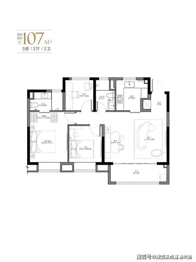107㎡是103㎡户型的PLUS版,厅面宽达到5.5米。汲取了103㎡户型所有的优点;如餐客厅一体,U型厨房,动静分离设计,大尺度主卧套间,以及每个卧室都附大面积飘窗。