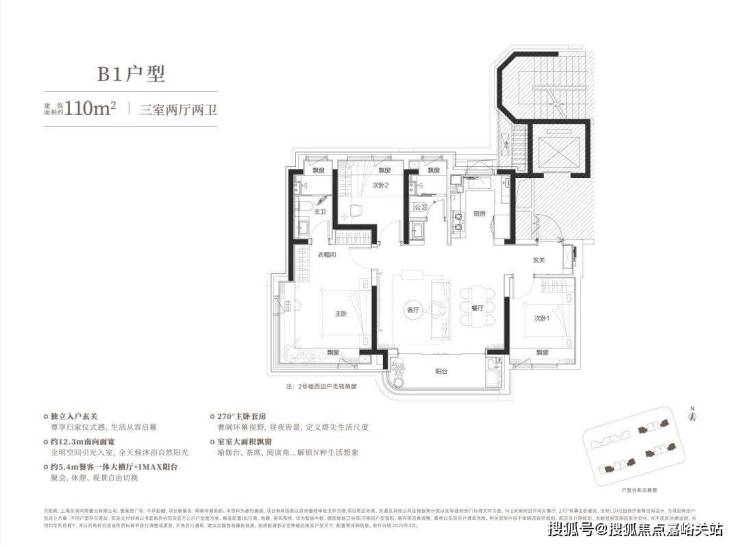 建面约 110㎡ 边套( B1户型) , 1 个 宽面阳台、 5 个 飘窗 , 整体南向面宽做到了约 12.3米,大横厅面宽约5.4米,带来超大空间体验和充足通风采光。更为难得的是,该户型标配了全屋飘窗,主卧更是拥有270°转角飘窗,拓宽室内景观视野的同时,增加了实际空间使用率,加上三玻两腔系统窗隔音,在欣赏窗外景色的同时,也不会被噪音打扰。建面约110㎡中间套 ( B2户型) ,也同样做到了南北通透,三开间朝南,洄游动线,布局合理,无论是空间尺度还是通风采光, 与 边套 享受一样的品质感 !