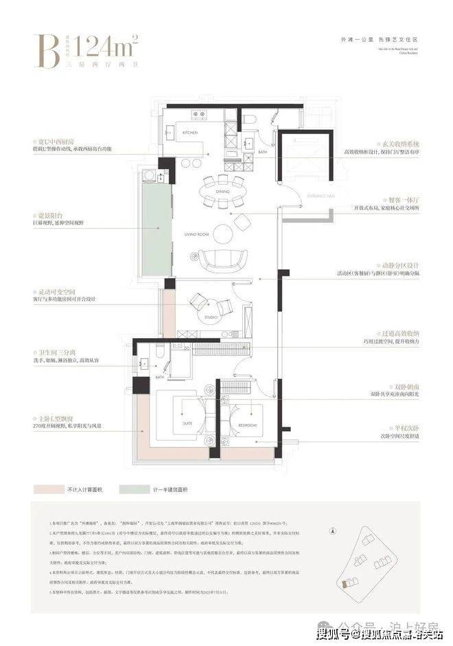 对于建面约124㎡户型,我的第一感觉是“十年难遇”。当外滩板块的新房面积,基本站上200㎡+,总价普遍顶破4000万关口,外滩瑞府以建面约124㎡(板块五年内难得的小户型),为入住外滩撕开一道珍贵缺口: