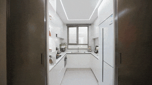开放式厨房在U型操作台面的基础上,还能放下双开门冰箱;