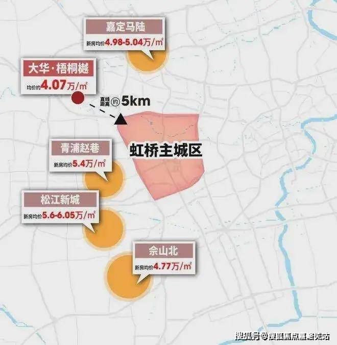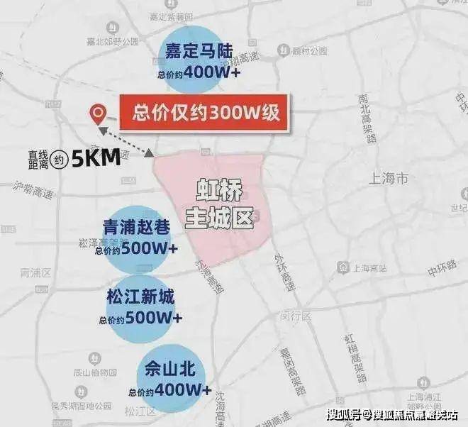 通过百度地图测距我们发现:安亭距离虹桥主城区直线距离仅约5公里,但总价仅约300万级!