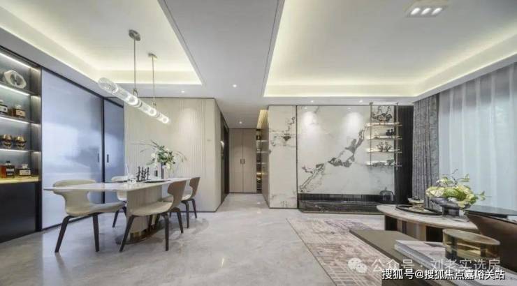 金茂定制壁布或墙纸交标结合芬迪白岩板客厅背景墙,地面采用马可波罗(或同等品牌)大板砖,以定制设计感提升空间立体感。