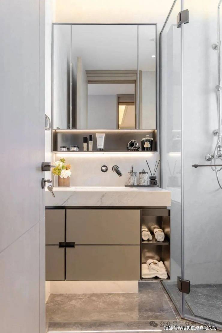 卫生间配备吉博力的壁挂马桶,科勒的花洒龙头及五金,台盆柜/镜柜/玻璃淋浴房皆是金茂定制等,将精致拉满。