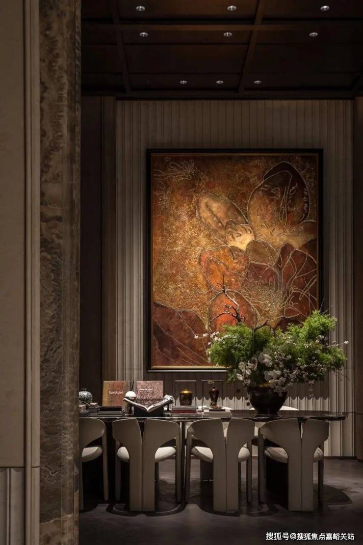 王府规制的通高大门,镶嵌昂贵天然水墨玉,自然天成的“山水画”,传递“玉出东方,门纳乾坤”的美好寓意;会客区域非遗艺术家画作《繁花映春》,耗时3月而成,诠释历久弥新的艺术价值。