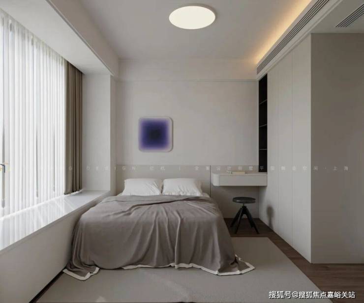 简约奶油风设计,营造舒缓氛围。浅灰色床品温柔舒适,通顶白色衣柜收纳力强大且视觉清爽。
