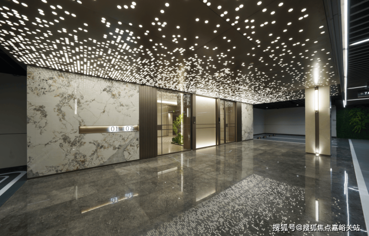 从项目南入口, 穿越前厅的潺潺水景,便是与社区建筑完美融合的门厅大堂,其设计简约而不失精致,摒弃繁复细节,彰显出新海派独有的高雅格调。