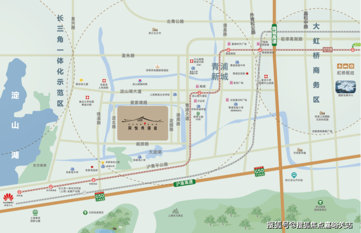 项目与17号线淀山湖大道站直线距离约2.5公里,通过17号线可直达虹桥商务区,并且能无缝换乘2/10号线,快速接驳上海市中心。