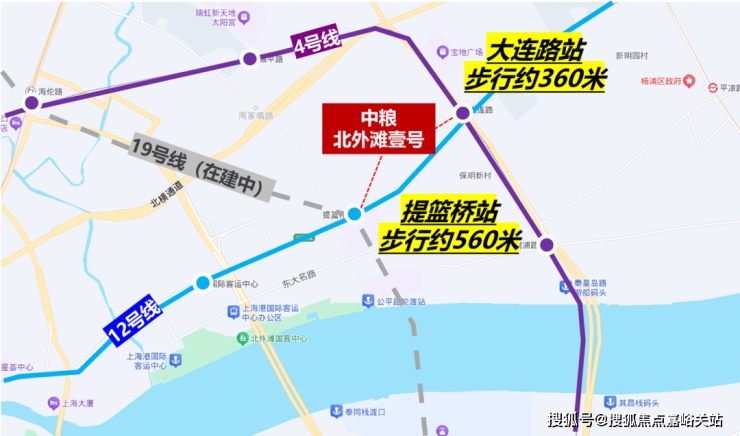 交通方面: 项目周围环绕三条地铁,步行约360米到4、12号线大连路站,步行约560米到12、19号线(在建)提篮桥站。