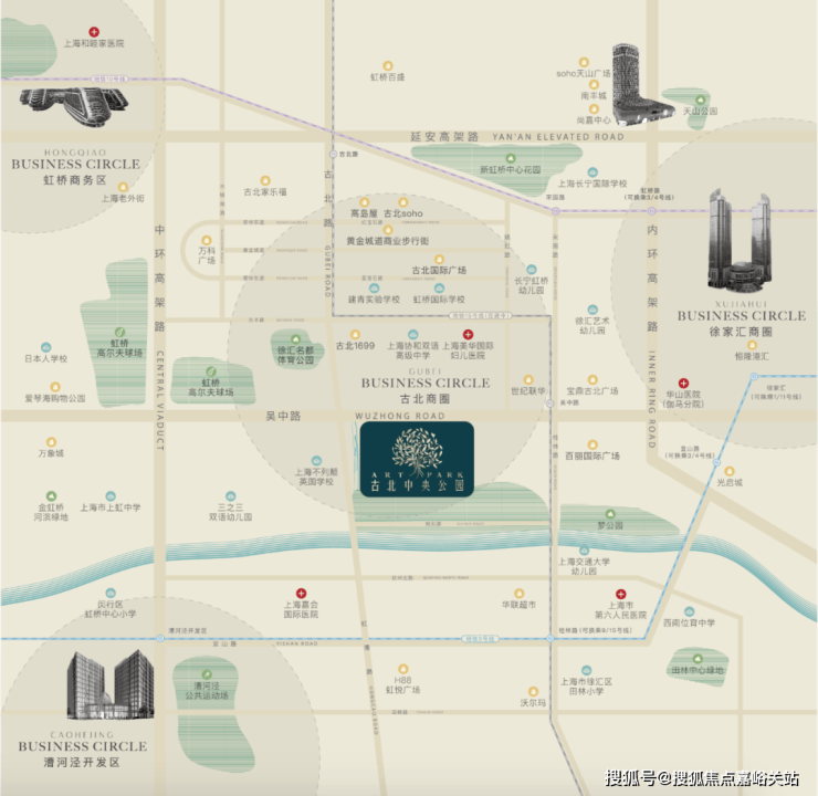 商业配套: 周边商业配套非常成熟,东西南北任何一方位都能满足业主日常消费。往东就是徐家汇商圈,拥有对标上海国金的高端商业ITC;南面是徐汇区日月光与漕河泾产业园区;西面有万象城和爱琴海2大购物中心,以及日韩人士聚集的韩国街(虹泉路);同时项目北面有 古北1699 、高岛屋、以及大量外籍人士非常喜欢去的黄金城道步行街及尚嘉中心和 南丰城 。