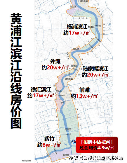 杨浦滨江均价约17万+/㎡、外滩均价约20万+/㎡、陆家嘴均价约20万+ /㎡、徐汇滨江均价约17万+/㎡、前滩均价约13万+ /㎡、紫竹均价约8W+/㎡……