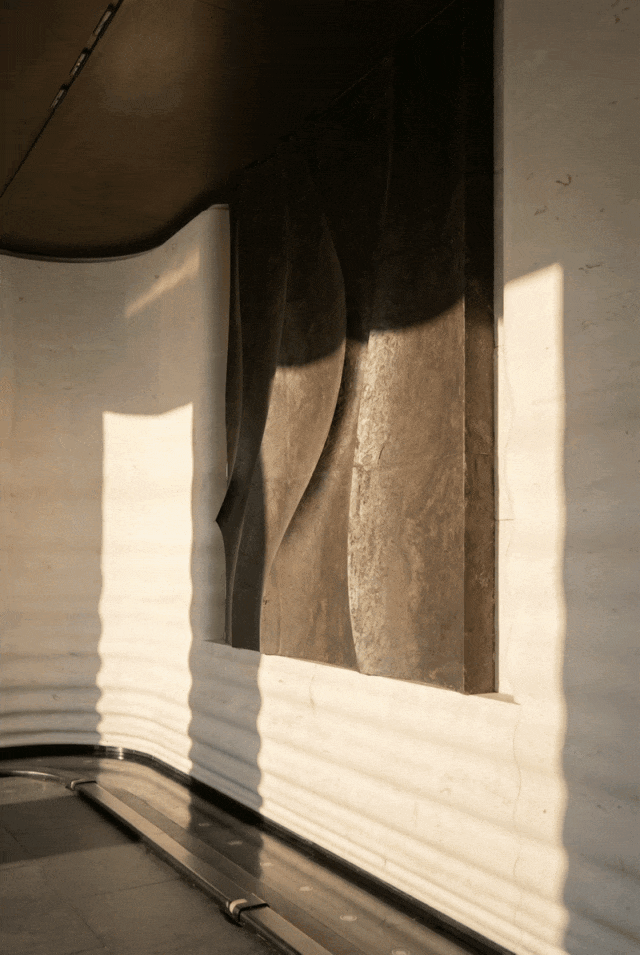 循径深入,一方藏于繁华深处的秘境花园豁然展现。一进序厅以水为主题,以"揉石成缎"的工艺致敬张江人"万川归海,而海不盈"的精神。结合黄浦江波浪水纹的意象进行抽象提炼,锻造石材,形成褶皱的肌理,打造富有变化的温润表情。