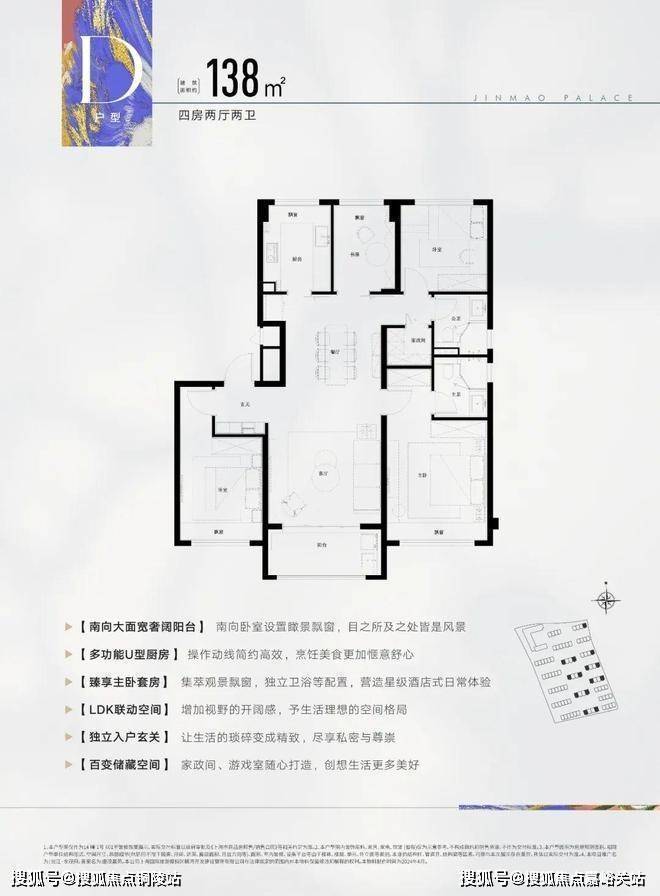此户型为飞机户型,可以说是改善人群非常喜欢的户型,建面约138㎡4房2厅2卫设计,动静分区,三开间朝南,各空间尺度奢阔,还有一个大面宽景观阳台,实现功能性和舒适度兼得。