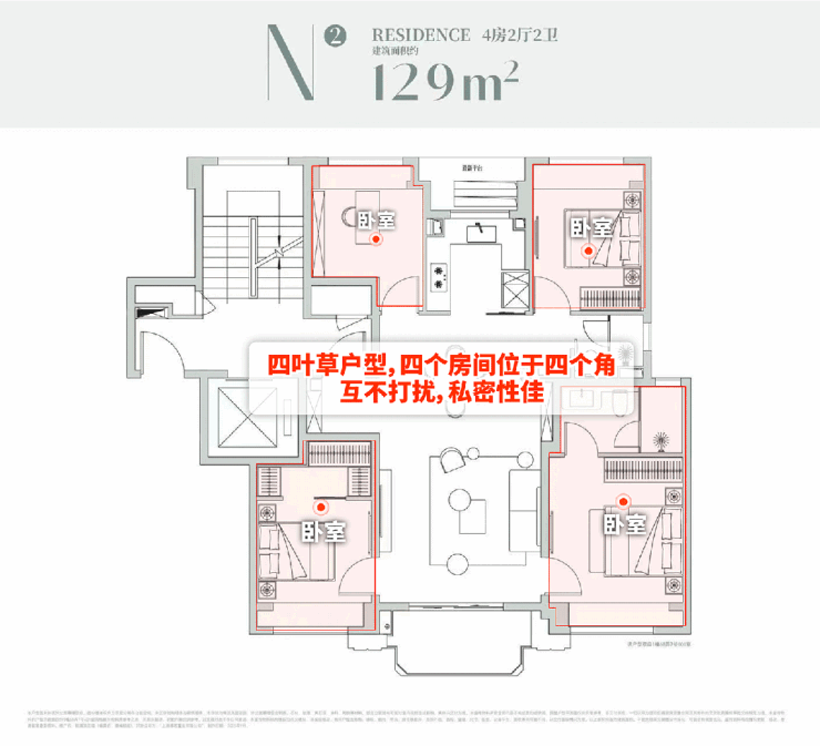 机遇2: 高性价比4房 ——滨江4房普遍190㎡起步,而项目129㎡4房不仅总价可控,更以四叶草设计实现空间利用率与居住舒适度的平衡;