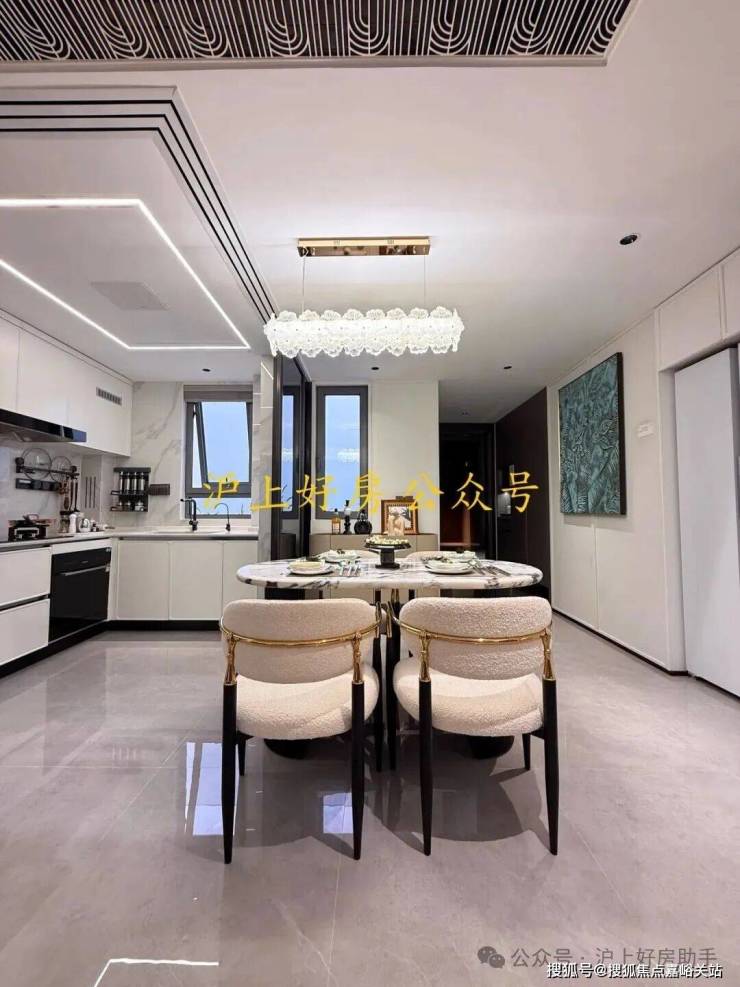 地面通铺浅灰色的仿大理石瓷砖,与吊顶的大灯池形成鲜明对比,加上一个大吊灯,氛围感满满。