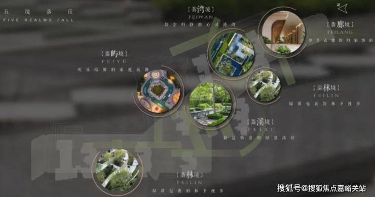 规划了 “翡色五境”五大空间氛围,匠造融入时光、人文海派、自然与艺术、家庭与邻里的 “四轴、三园、五区、一所”四大功能空间。