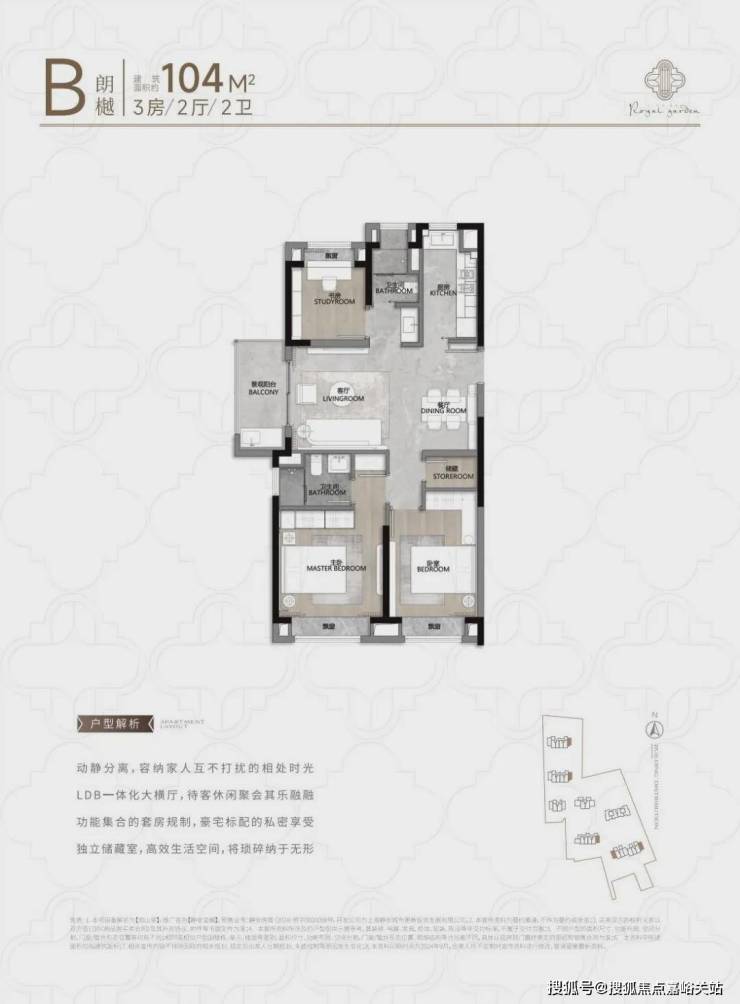 104㎡3户型特点:该户型多为楼栋的 东边套,是一个观景户型。客厅连接270°阳台,视野出众。双卧朝南,阳光满溢。从次卫布局看,如果家庭人口较少,该户型还能做成双套卧。