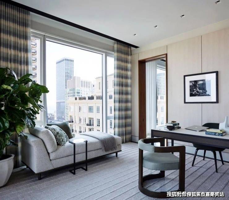 百分之百的优雅对材质的要求异常严格,而胡桃木的材质恰好强调了空间的高级感,利用老式LaVerne茶几、KellyWearstler的椅子和FortStreetStudio的地毯让人仿佛穿越回五十年代的复古时空.