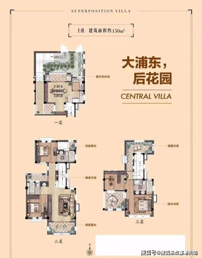 上叠户型是建筑面积150平米的三层,4房2厅中西双厨的全套房设计,特设独立花园入户通道,保障业主私密性。