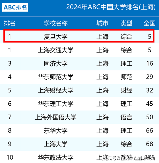 根据认可度、权威性更高的2024年ABC中国大学排行榜,2024年复旦位列上海第1,全国第5。