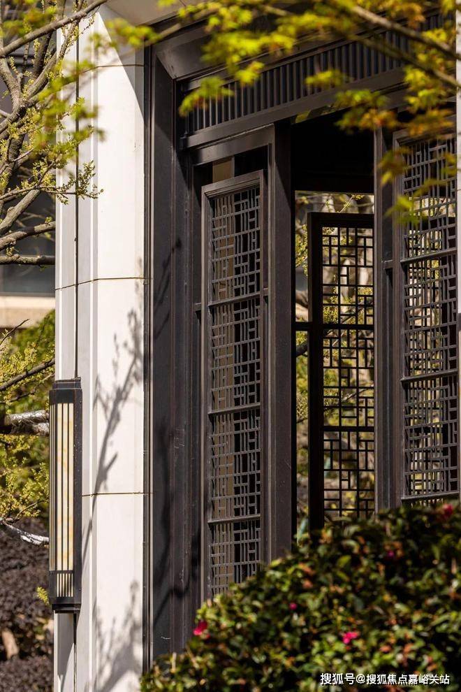 再来看公区,庭院的格栅,同样做了造型化处理,镂空形状不一,随着日光位置的变化,阳光洒落,造型十分灵动。