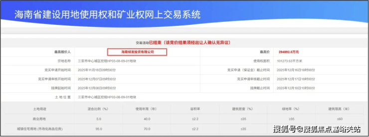 12月18日,中国绿发以底价29.49亿元竞得三亚市中心城区控规HP03-08-09-01地块,折合楼面价约1.32万元/平方米。该地块占地约152亩,容积率2.2,限高60米,北侧临水兼具河景与二线海景资源。