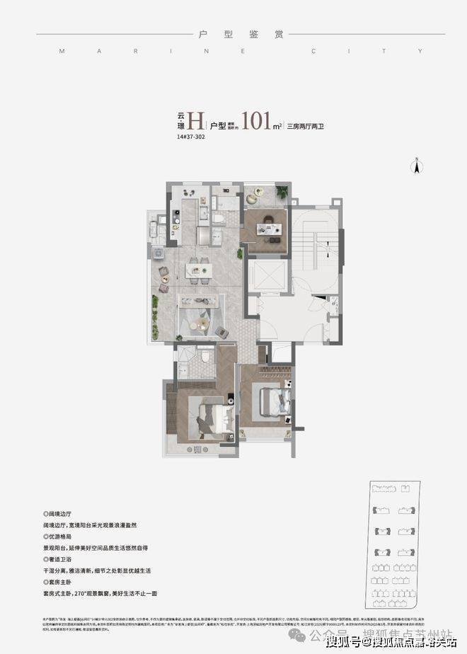 部分建面约100-101㎡H边厅户型,全景阳台搭配主卧L型转角大飘窗,三面采光+270°环幕视野,景观面堪比市区滨江顶豪,白天远眺松江人文,晚上看脚下星火流淌,十分惬意。