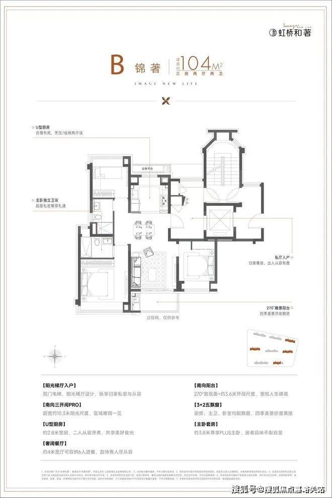 建面约104㎡舒适三房,三开间朝南+动静分区,设计水准颇高。特别是宽景阳台的设置,为客厅配备一幅iMax广角视野,多角度观赏社区美景,适配对品质有需求的首置或首改客户。