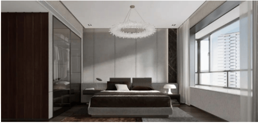 在主卧的打造上是经典的“酒店式”套房设计,在保证私密空间不受打扰的同时,还拥有清晰流畅的动线快速抵达其他功能区。