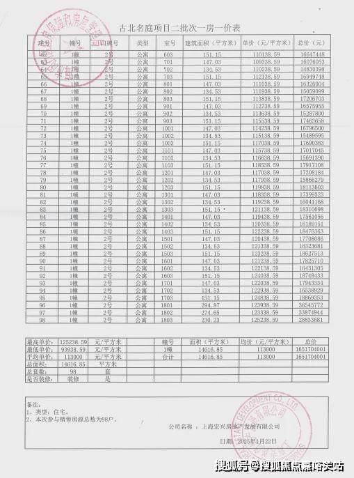 上期一房一价表如下